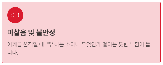 팔을 60~120도 사이에서 들어올릴 때 통증이 심해지는 '통증 호(arc)' 현상이 잘 나타납니다.