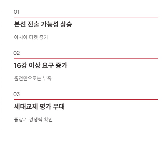 하지만 반대로 본선 진출의 희소성이 줄어들면서 본선에서 어떤 성과를 내느냐가 더 중요해지는 구조로 바뀌게 됩니다.
