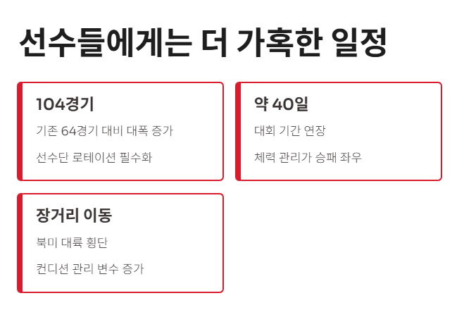 이 때문에 각 국가대표팀은 선발 11명 중심의 운영보다 선수 로테이션과 전술적 유연성이 더욱 중요해질 전망입니다.