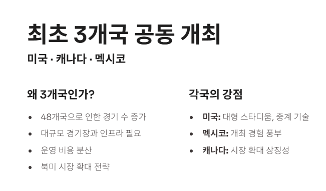 멕시코는 월드컵 개최 경험이 풍부하고, 캐나다는 북미 축구 시장 확대라는 상징성을 갖습니다.
