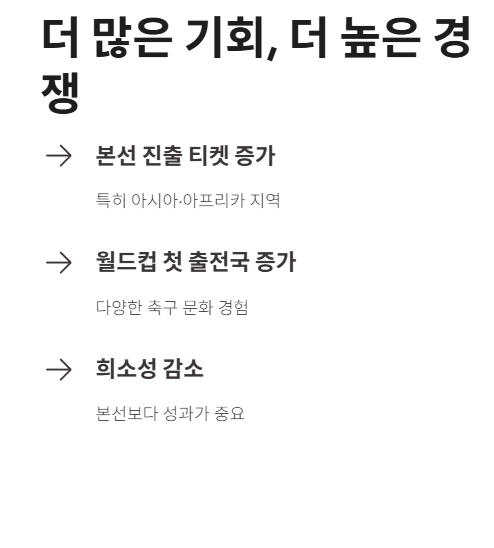 2026년 월드컵의 가장 큰 변화는 본선 참가국이 48개국으로 늘어난다는 점입니다.